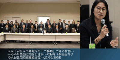 人が「安全かつ尊厳をもって移動」できる世界へ—IOMの包括的支援と日本への期待(保田由布子 IOM上級民間連携担当官)(27/10/2025) 2025-10-27 0 comment IOM駐日事務所の保田由布子・上級民間連携担当官は、紛争・災害・貧困など多様な要因による移動に対し、IOMが安全・合法・尊厳ある移動と受入社… Read More >>
