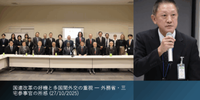 国連改革の好機と多国間外交の重視 ― 外務省・三宅参事官の所感 (27/10/2025) 2025-10-27 0 comment 国連創設80周年という節目に、既存の国際秩序が挑戦を受け多国間主義が困難に直面する現状を踏まえ、議論の場の意義を強調。国連総会での石破総理演… Read More >>