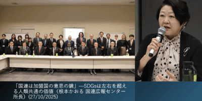 「国連は加盟国の意思の鏡」—SDGsは左右を超える人類共通の価値(根本かおる 国連広報センター所長)(27/10/2025) 2025-10-27 0 comment 国連広報センターの根本かおる所長は、冷戦終結期の国連への期待と現在の厳しい国際環境を対比し、マーガレット・サッチャーの言葉「国連は加盟国の意… Read More >>