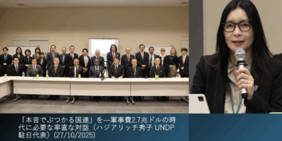 「本音でぶつかる国連」を—軍事費2.7兆ドルの時代に必要な率直な対話(ハジアリッチ秀子 UNDP駐日代表)(27/10/2025) 2025-10-27 0 comment UNDP駐日代表のハジアリッチ秀子氏は、マルチラテラリズムの枠外にいれば排除感が生じる現実に触れ、国連が機能するための前提は加盟国の政治的意… Read More >>