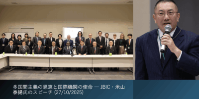多国間主義の恩恵と国際機関の使命 ― JBIC・米山泰揚氏のスピーチ (27/10/2025) 2025-10-27 0 comment 世界銀行日本代表の経験を踏まえ、日本・アジアの高度成長は多国間主義がもたらした良好な国際環境の恩恵であったと指摘。国際機関は歴史的苦難を繰り… Read More >>